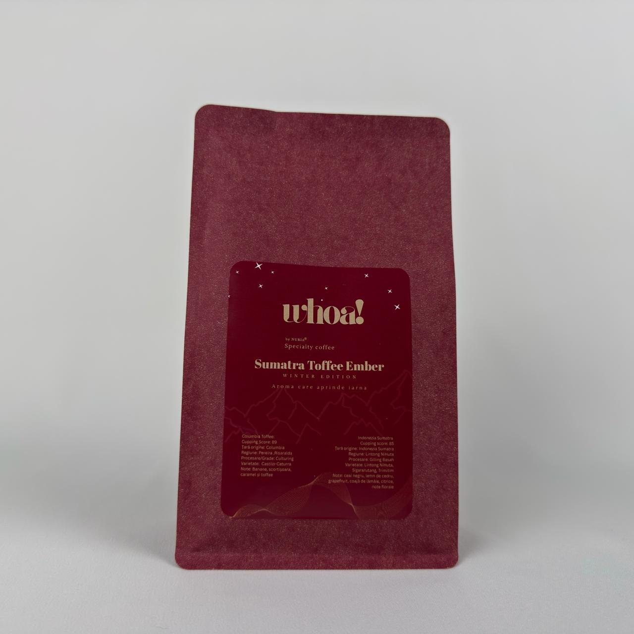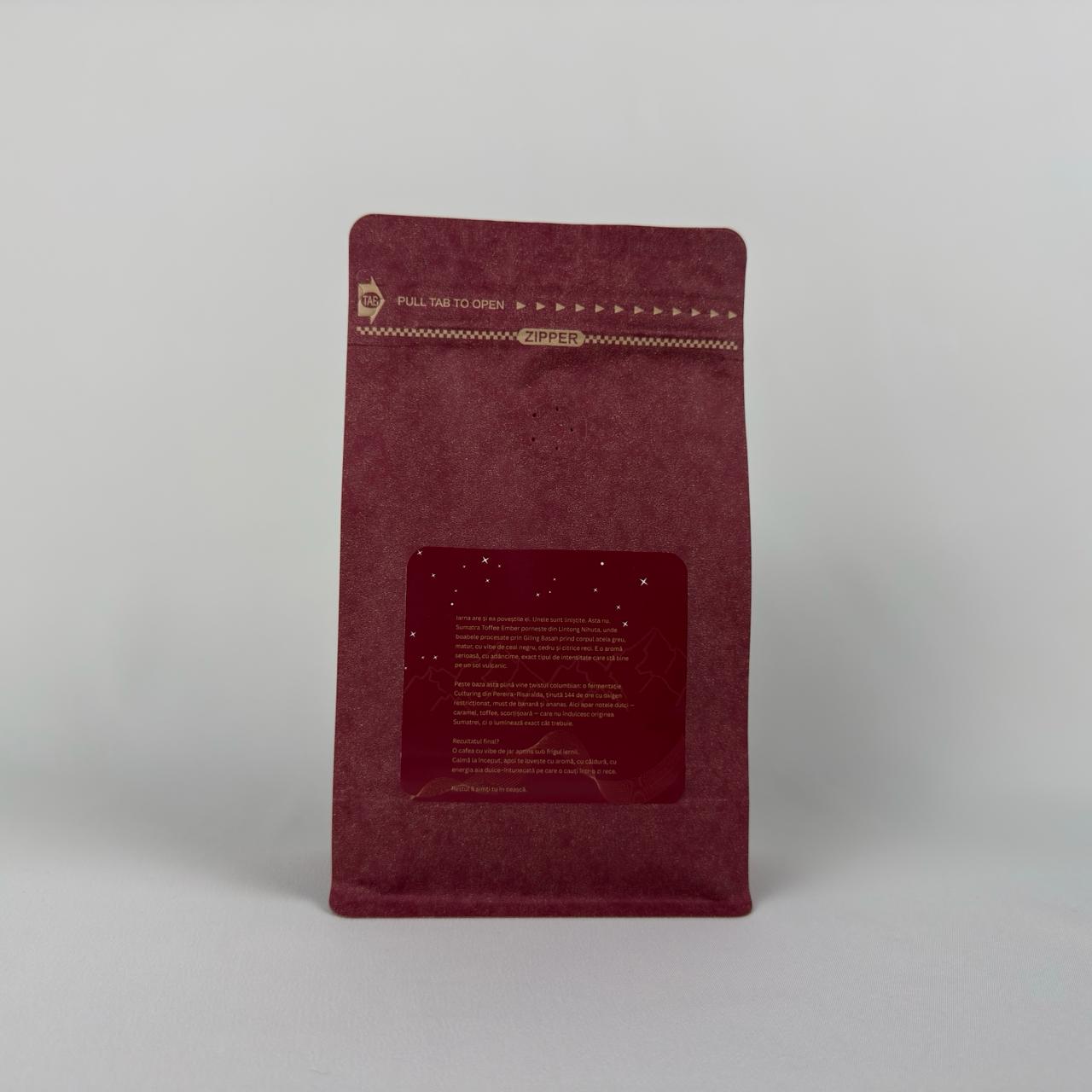 Sumatra Toffee Ember pornește din Lintong Nihuta, unde boabele procesate prin Giling Basah prind corpul acela greu, matur, cu vibe de ceai negru, cedru și citrice reci. E o aromă serioasă, cu adâncime, exact tipul de intensitate care stă bine pe un sol vulcanic.